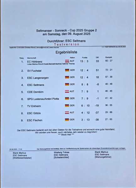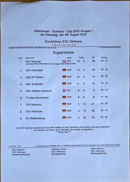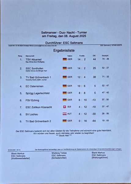 Anlässlich zum 30.-jährigen Vereinsbestehen veranstaltete der ESC Seltmans am 08.08.2025 zusätzlich zum regulären Sonneckcup ein internationales Nacht-Duo. Es reisten insgesamt neun Mannschaften á zwei Spielern an. Nach einer kurzen Ansprache ließ der 1.Vorsitzende Peter Baumbach das erste von 3 Turnieren am Wochenende um 19:30 Uhr anpfeifen. Nach einem erfolgreichen Abend ging es am Schluss nur um die Stocknote für den Turniersieg. Der Sieger war der TSV Altusried mit einer Punktzahl von 14:2 und einer Stockdifferenz von 44. Zweiter wurde der SSC Sonthofen mit der gleichen Punktzahl aber niedrigerer Differenz von 25. Dritter wurde der TV Bad Grönenbach I (12:4).